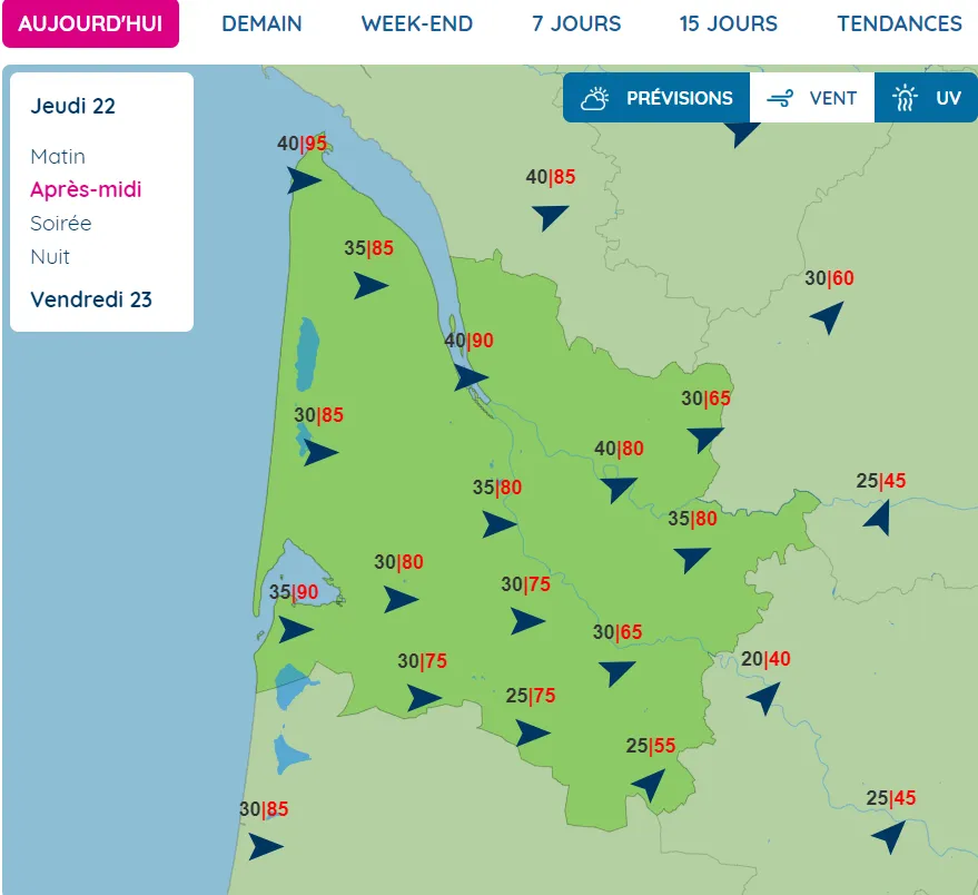 En Gironde, voici ci-dessous ce qui vous attend cet après-midi : comme l'indique la carte de Météo France, des pointes à 95km/h sont attendues dans le Médoc.