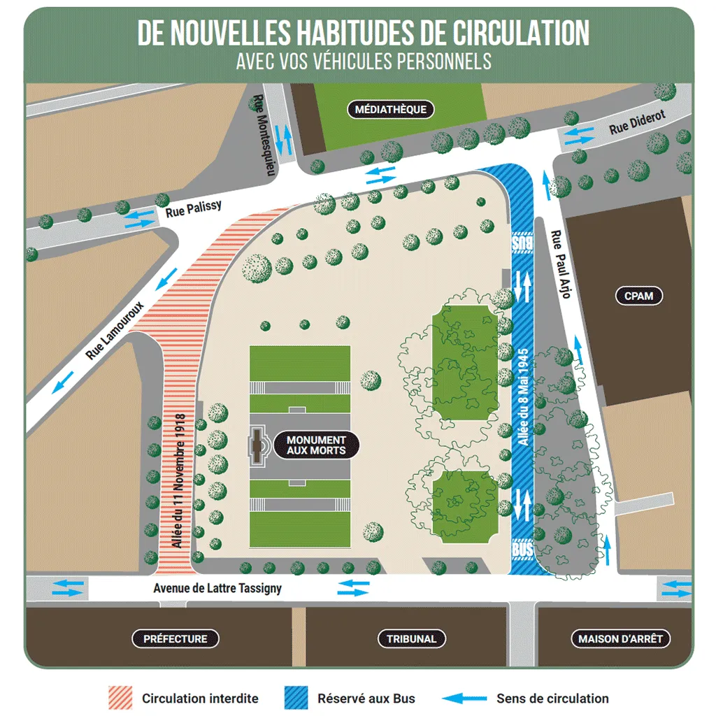 Ne soyez pas surpris, il va y avoir du changement autour de la place Armand Fallières entre aujourd'hui et le 16 février. Le test de circulation commence ce lundi 8 janvier dans le cadre de la transformation du lieu en parc. Au programme : la fermeture de l'allée du 11 Novembre 1918, le déplacement des arrêts de bus des lignes régulières et scolaires, la fermeture de l'allée du 8 Mai 1945 qui devient une voie réservée aux bus, une déviation de la circulation par la rue Paul Arjo et la mise en place d'une signalétique temporaire.
